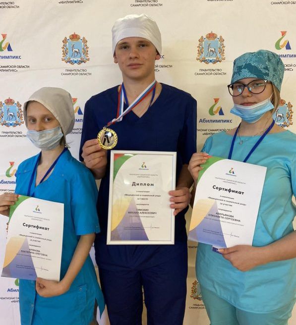 Сызранский медико-гуманитарный колледж представляли: Тимохин Михаил, Арянова Екатерина и Аверьянова Елизавета, обучающиеся по специальности Сестринское дело (преподаватель - наставник Брагина Т.М.). В компетенции «Медицинский и социальный уход» победителем стал Тимохин Михаил и занял 1 место.