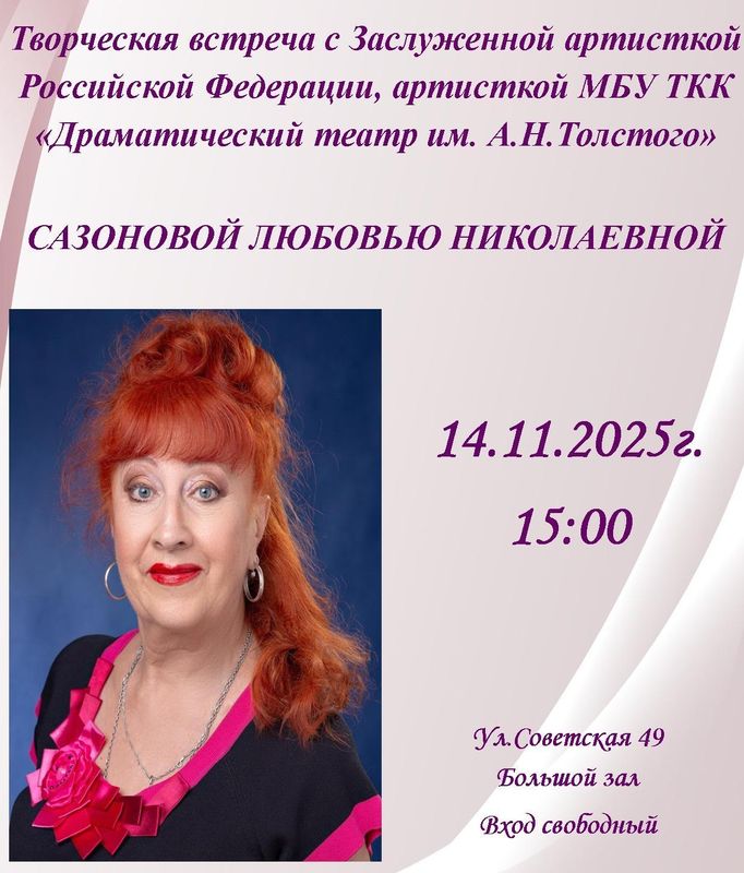 Лучшая Лиса Алиса сызранского театра, Заслуженная артистка Российской Федерации Любовь Сазонова встретится с юными горожанами. Встреча пройдет в Детской школе искусств №1 14 ноября в 15 часов. Ее называют самой шикарной Лисой Алисой, но так можно сказать едва ли не о каждой роли заслуженной артистки РФ Любови Сазоновой. Актриса, обладающая высочайшей сценической культурой, широким исполнительским диапазоном, неизменно демонстрирует в спектаклях два ценных качества – искренность плюс мастерство.