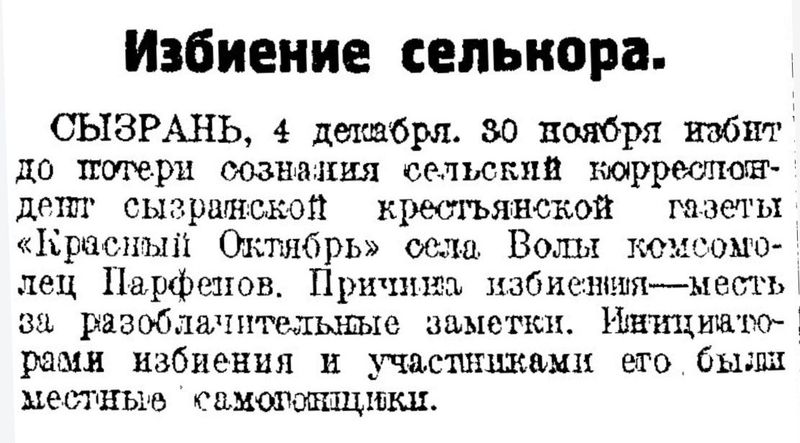 Причиной стали разоблачения молодого корреспондента газеты. В селе Валы под Сызранью пострадал молодой человек: корреспондент городской газеты «Красный Октябрь» был избит до потери сознания за свои бескомпромиссные публикации. Криминальный инцидент, в результате которого журналист газеты получил травмы, произошел более 100 лет назад, 30 ноября 1924 года. О возмутительном случае писали газеты страны - «Правда», «Известия», а заметку сохранил telegram-канал «Вспомнить Сызрань». «Избит до потери сознания сельский корреспондент сызранской крестьянской газеты «Красный Октябрь» комсомолец Парфенов. Причина избиения - месть за разоблачительные заметки. Инициаторами избиения и участниками его были местные самогонщики», -
