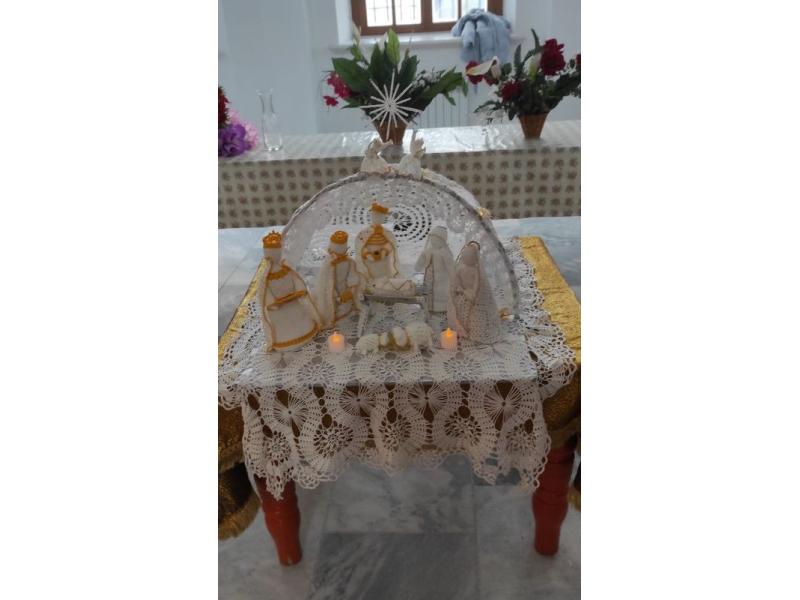 Симпатичным рукоделием порадовала жительница Шигонского района прихожан Никольского храма в селе Усолье. В приходе с нетерпением ждут Рождества, и ожидание праздника сподвигло сотрудницу храма Валентину Писареву создать вертеп в модном сейчас вязаном стиле. Из белоснежной и золотой пряжи Валентина Михайловна изобразила Святое семейство: фигурки Иосифа, Марии, только что родившегося Спасителя, овец в хлеву и волхвов, которые, увидев в небе Вифлеемскую звезду, пришли поклониться царю мира. Женщина мастерски сумела передать смысл сцены - от ее работы появляется ощущение покоя, тихого счастья, ожидания чуда. Как рассказали в Сызранской епархии, усольский храм решил подарить вертеп жителям села Маза. Сегодня дорогой подарок - вязаный вертеп приветствовал пришедших на Литургию прихожан.